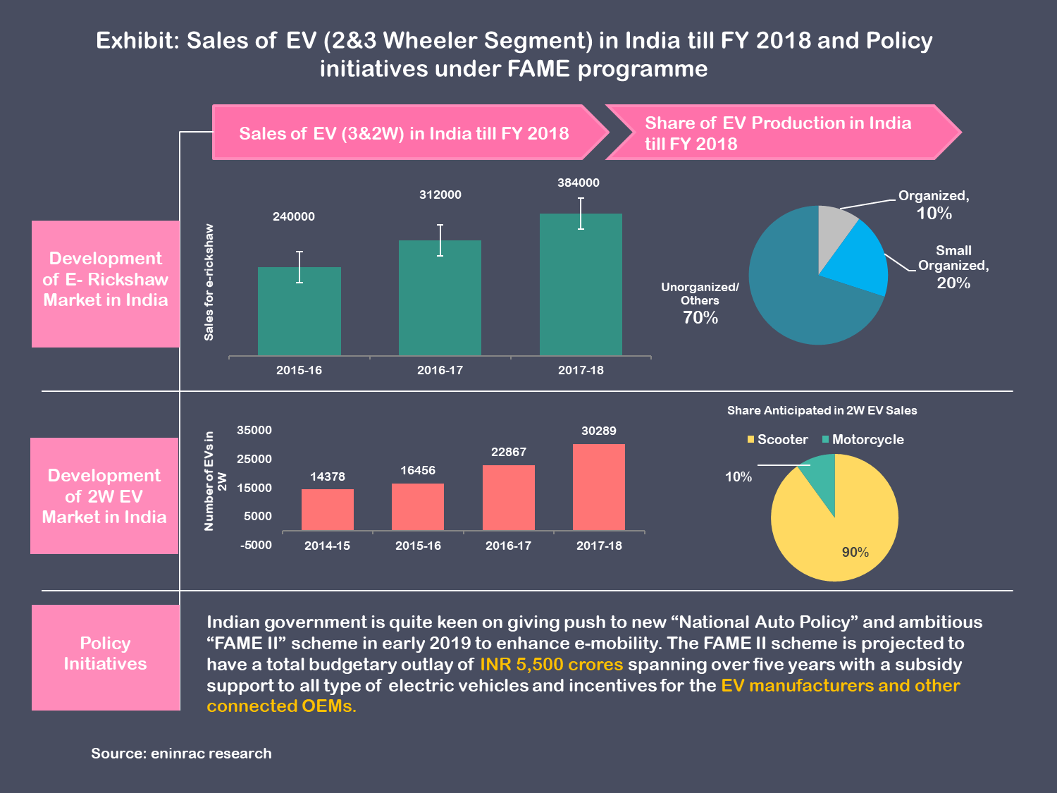 The Global automobile industry landscape is on the verge of disruption due to adoption of new business model, digitization given the government thrust in the industry. Similarly, India is not behind to revolutionize its own automobile sector where electrification is the prime agenda of the government. Electrification of the automobile sector is one of the reason to curb pollution as the government is planning towards building a green economy. With the help of thrust from government’s policies and subsidies schemes like FAME, the business preposition in the electric vehicle market has grown specially in 2W and 3W market in India. Considering the great potential in 2W & 3W segment, the government targets 30% Electric Vehicles (EV) on the roads by 2030. Going by the current rate of 7-8% CAGR growth in automobile sales, over 46,000,000 vehicles (two-, three-, and four-wheelers)could be sold in 2030. This annual market size would present an opportunity for Indian companies to become leaders in EV technology on a global scale.