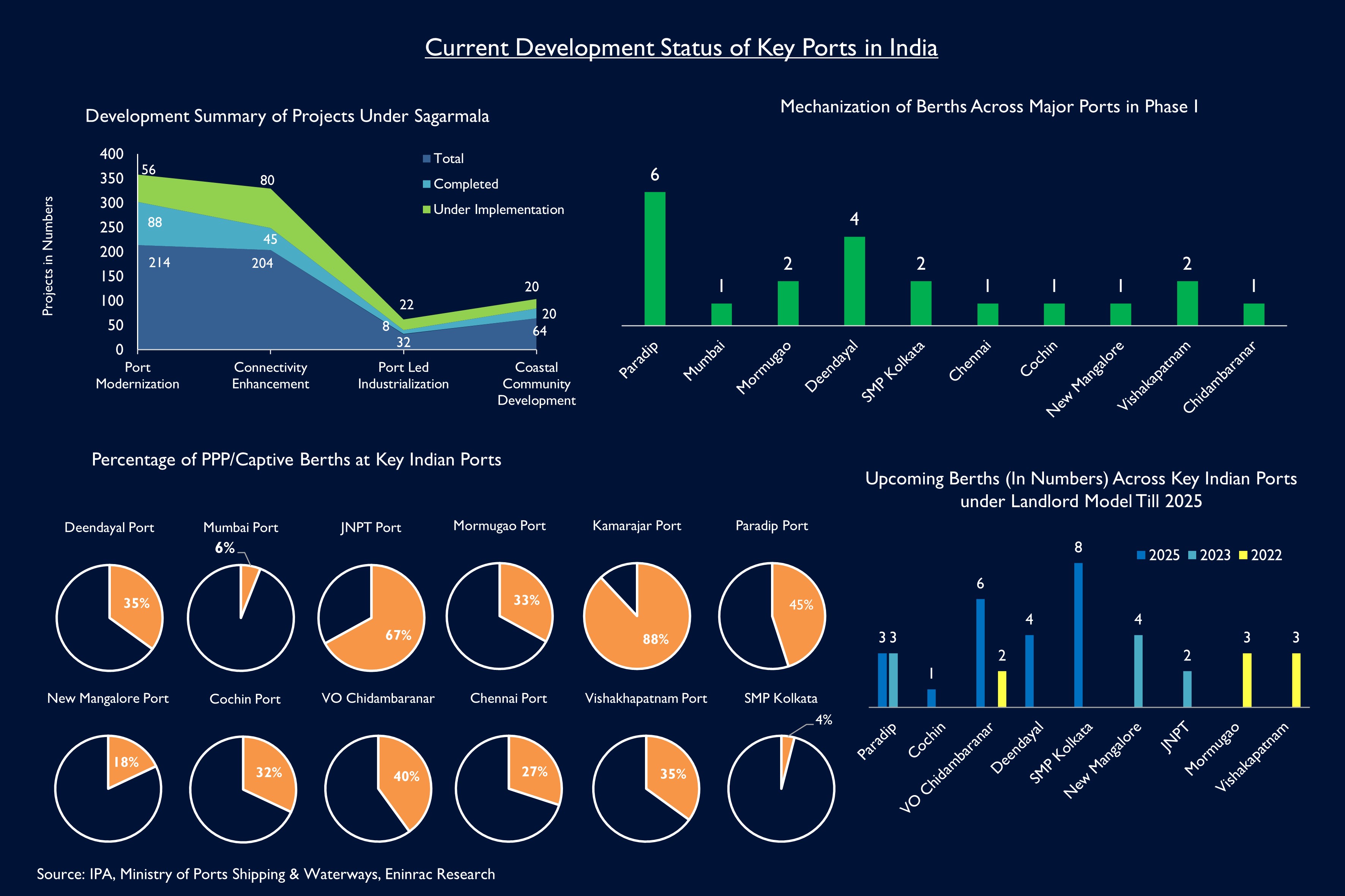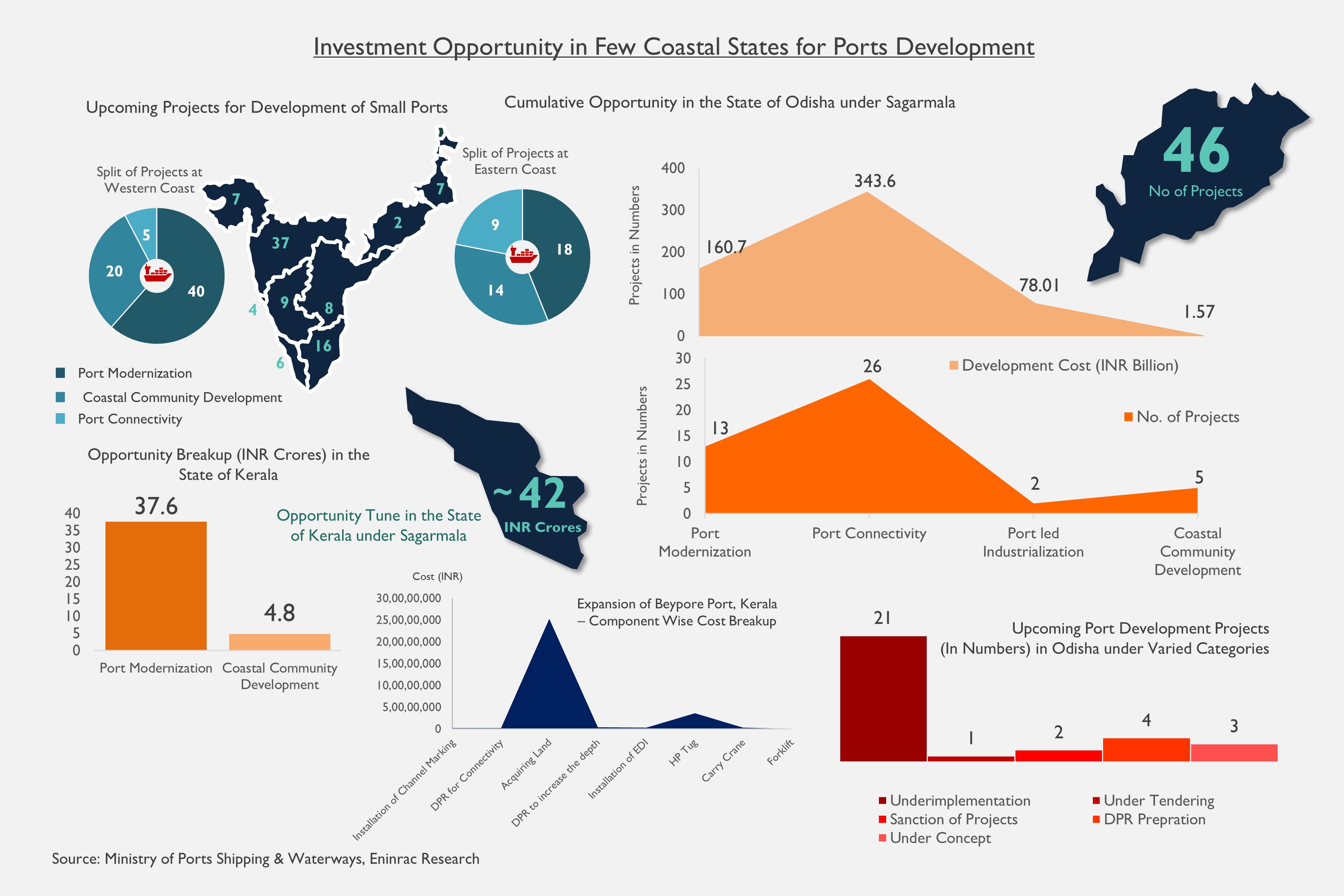The government of India is targeting to develop 25 new ports worth INR 7.7 Billion by 2025 under National Infrastructure Pipeline (NIP). Additionally, 58 projects involving a cost USD 6.6 Billion have been identified as part of the NIP for infrastructure augmentation and development at major ports up to 2025