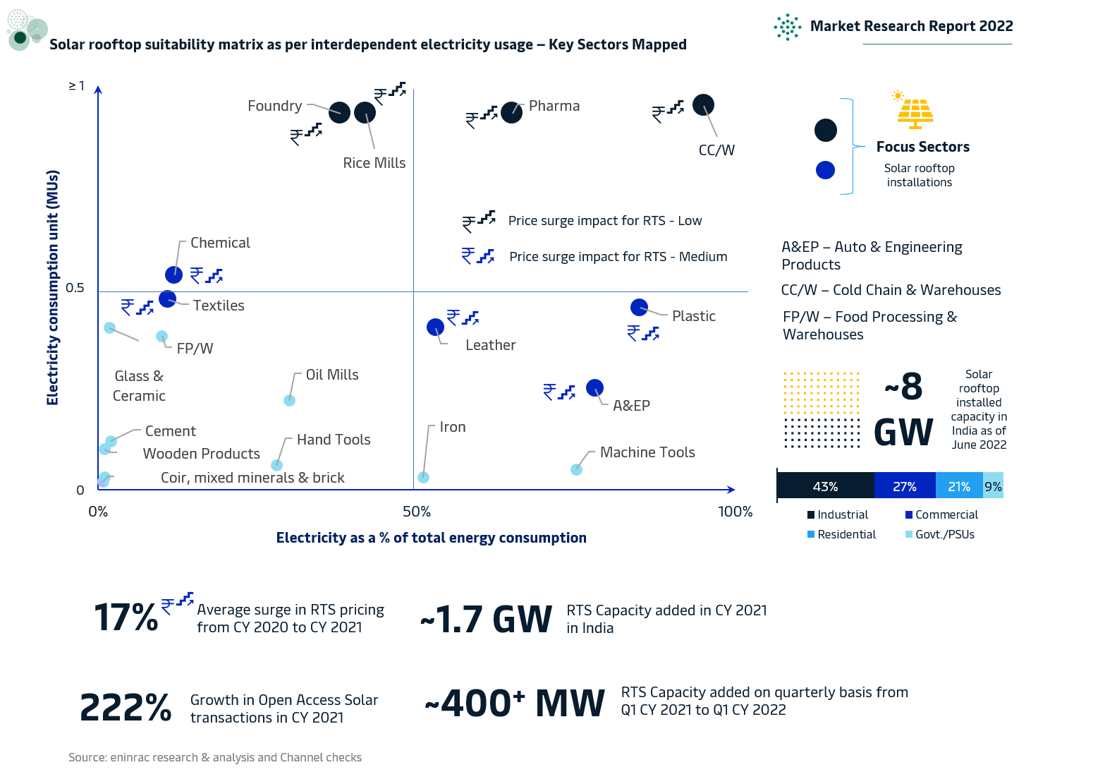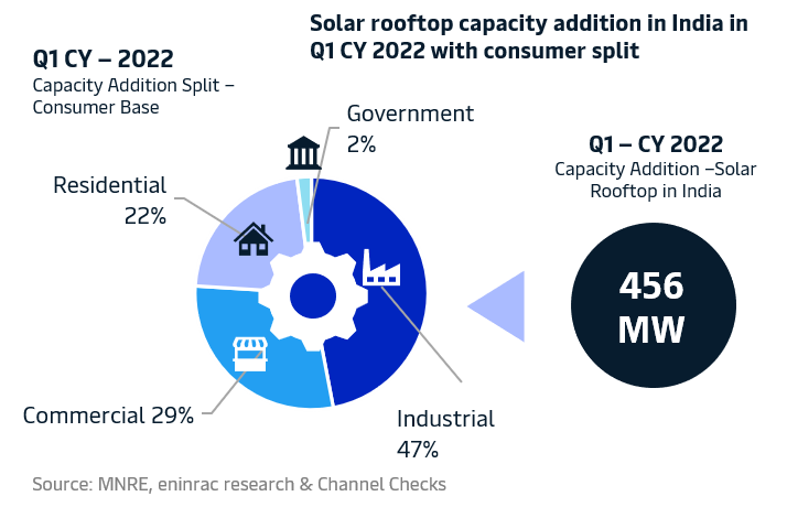 Solar rooftop is going to play a pivotal role in India’s capacity addition through utilization of energy from sun. While the utility scale solar capacity addition saw a significant jump of ~ 5 GW when compared on y-o-y basis for CY 2020 and CY 2021, respectively. Overall solar capacity addition in India breached the 10 GW in CY 2021 wherein the utility scale addition stood at 8.3 GW and solar rooftop contributed to 1.7 GW. This growth in momentum of solar rooftop capacity addition was driven mostly by commercial and industrial players at large. It is, however, pertinent to note that despite the north-bound trajectory of overall costs in terms of installation which grew nearly 17%