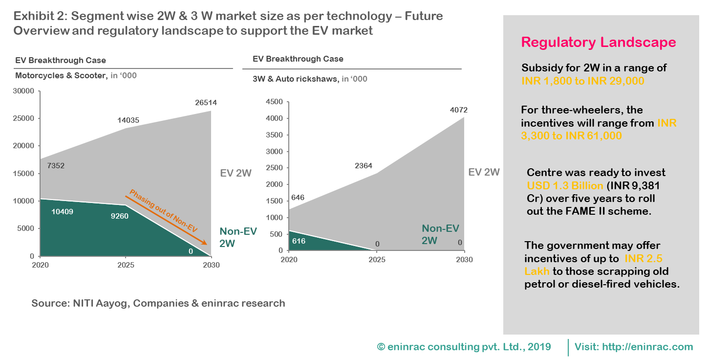 The Global automobile industry landscape is on the verge of disruption due to adoption of new business model, digitization given the government thrust in the industry. Similarly, India is not behind to revolutionize its own automobile sector where electrification is the prime agenda of the government. Electrification of the automobile sector is one of the reason to curb pollution as the government is planning towards building a green economy. With the help of thrust from government’s policies and subsidies schemes like FAME, the business preposition in the electric vehicle market has grown specially in 2W and 3W market in India. Considering the great potential in 2W & 3W segment, the government targets 30% Electric Vehicles (EV) on the roads by 2030. Going by the current rate of 7-8% CAGR growth in automobile sales, over 46,000,000 vehicles (two-, three-, and four-wheelers)could be sold in 2030. This annual market size would present an opportunity for Indian companies to become leaders in EV technology on a global scale.