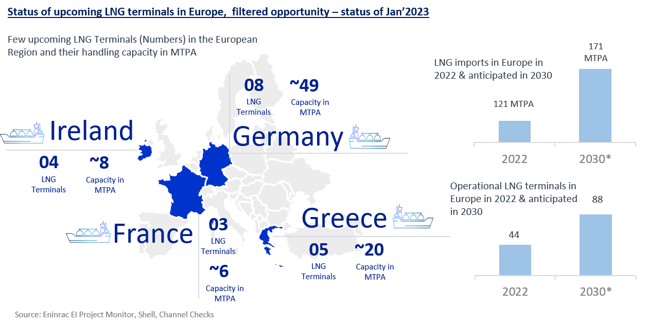 Get insights upon country wise latest assets development track on global LNG terminal infrastructure opportunity. Stay up-to-date about the newly proposed projects with Eninrac’s Energy Infra (EI) project monitor. Learn about how many new projects are upcoming across Asia Pacific, European, Eurasian, Middle-east, African & American countries, what is the LNG handling capacity of upcoming terminals , what is the investment tune, which players have announced new projects, do we have connected natural gas trunklines , can these upcoming terminals facilitate opportunity to store hydrogen, what is the development status of the project, what opportunity holds for EPC players etc. - this half yearly will help you understand all