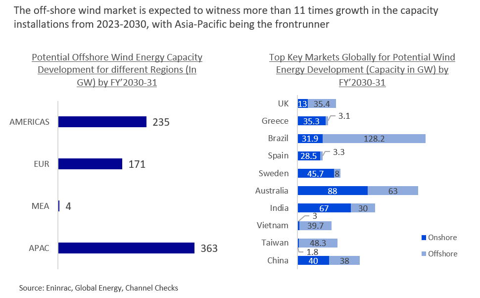 With permitting policy in place, Europe shall rebound its renewable energy growth anticipating more than two times addition in the current wind energy installed capacity by FY’2030-31, opening a potential market size of more than USD 500 Billion