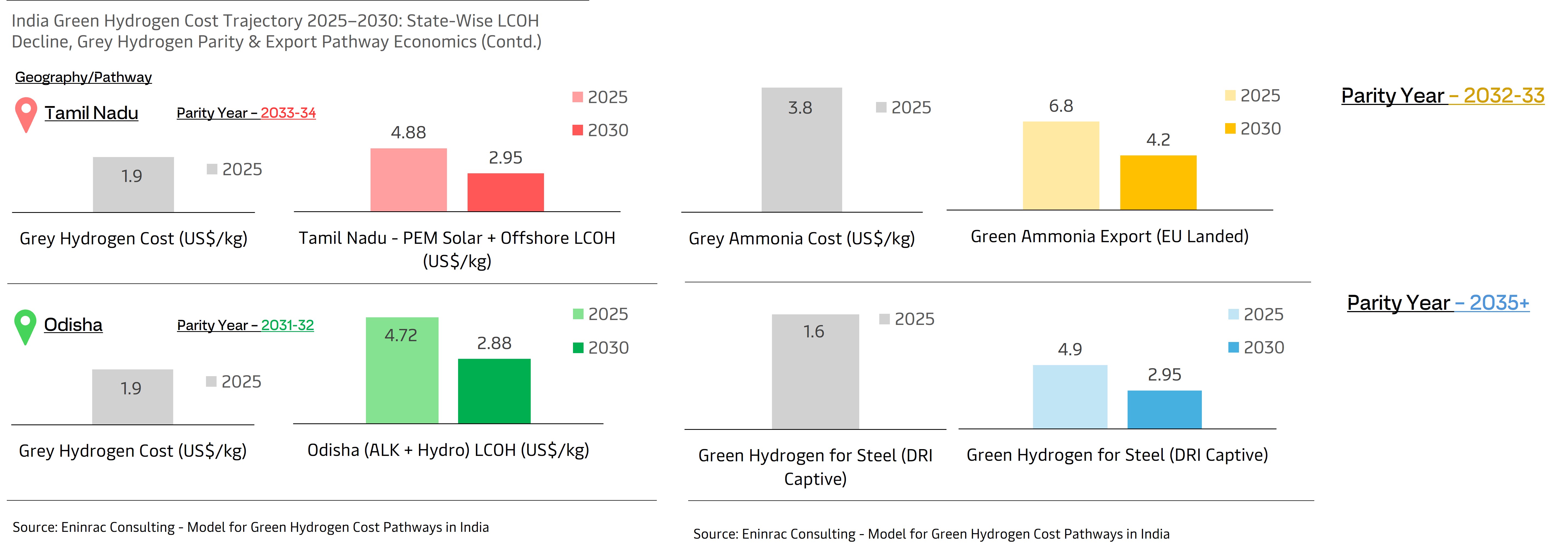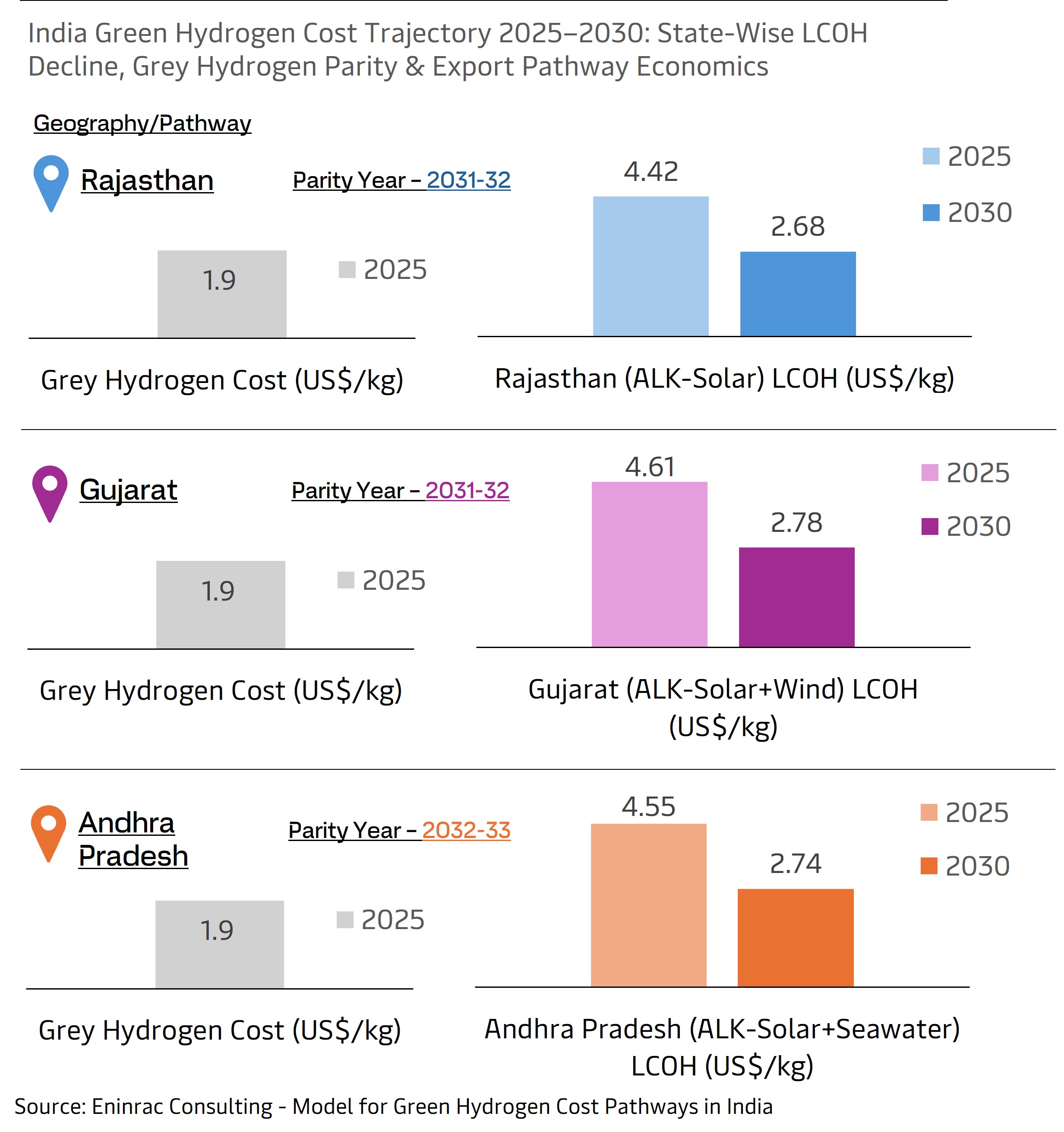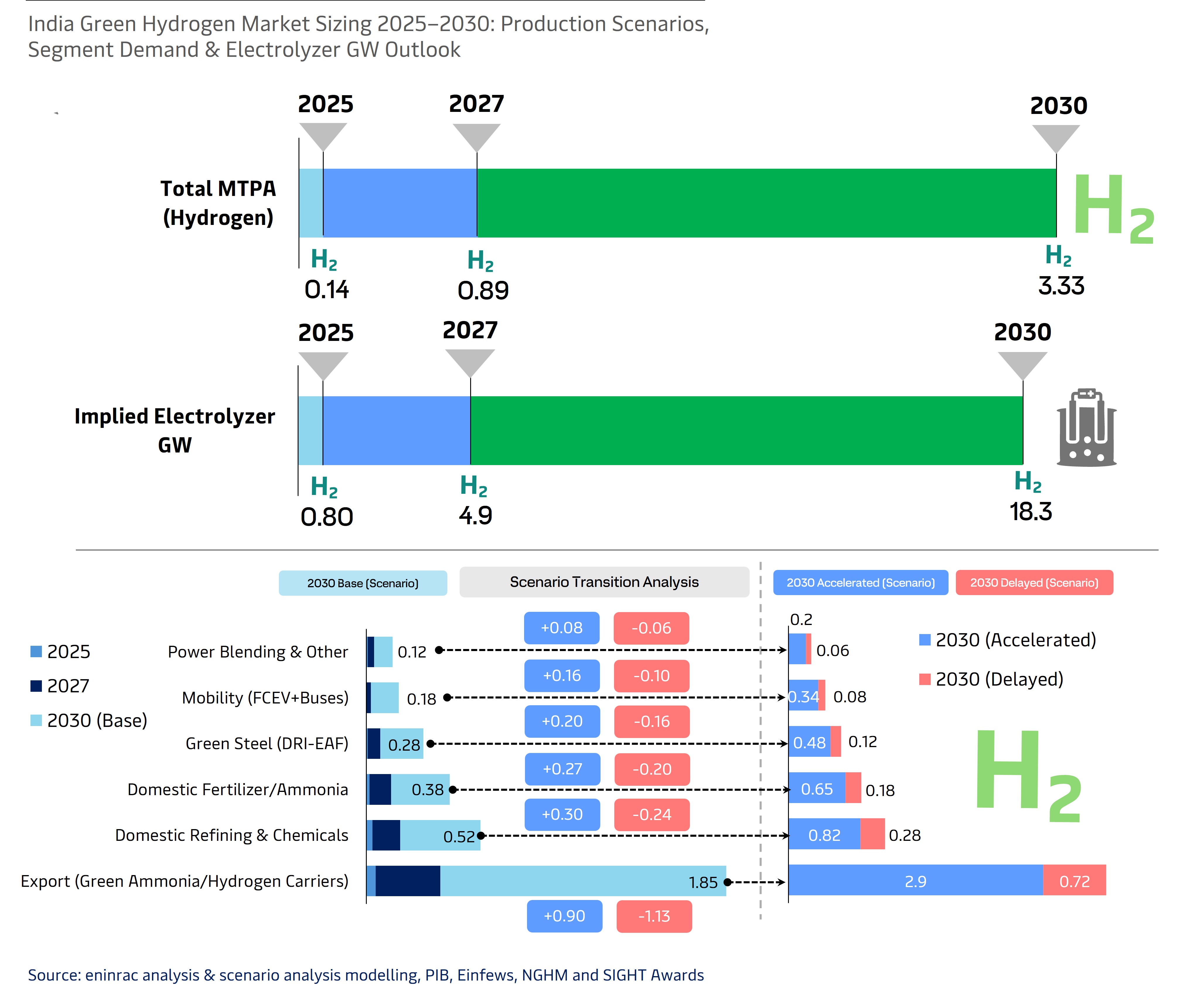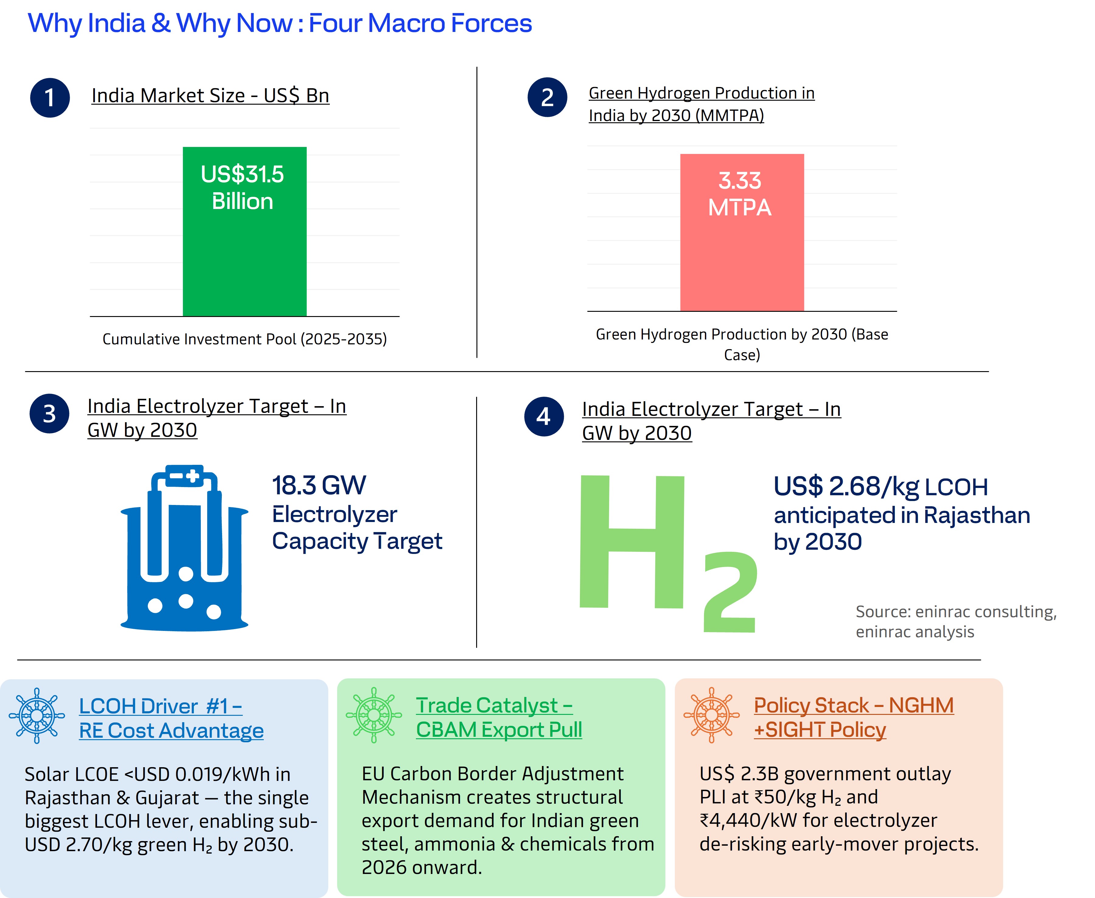 The report provides a comprehensive overview of India’s green hydrogen ecosystem across the value chain from renewable energy and electrolyzer manufacturing to storage, transport, end-use while evaluating capacity scenarios, capex trends, and risk-adjusted returns across eight segments through 2035