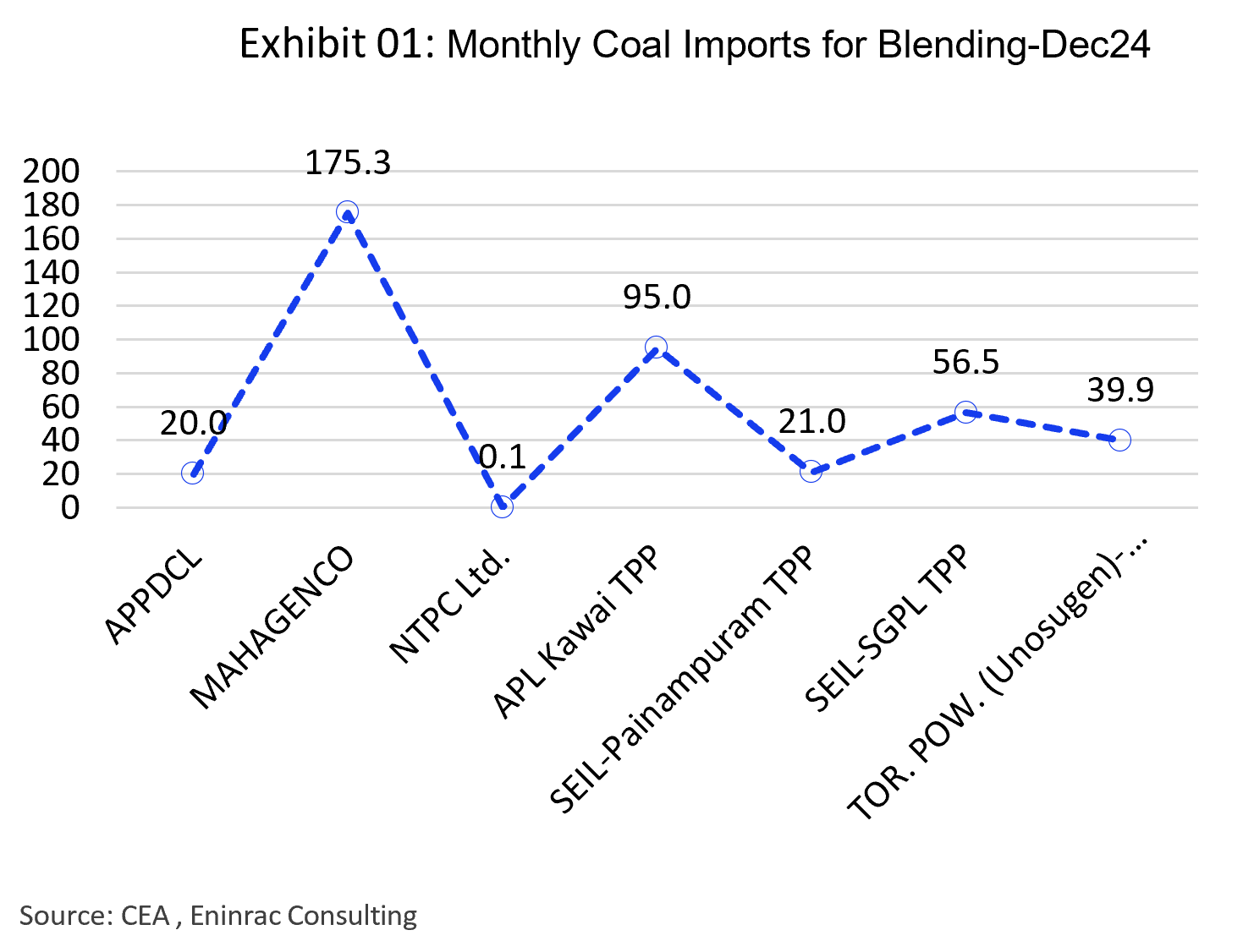 Rajasthan (Private Sector - APL Kawai TPP): The APL Kawai Thermal Power Plant in Rajasthan imported 1320 tons of coal, with a significant blending percentage of 95.0%. This indicates a strong reliance on imported coal for its power generation.