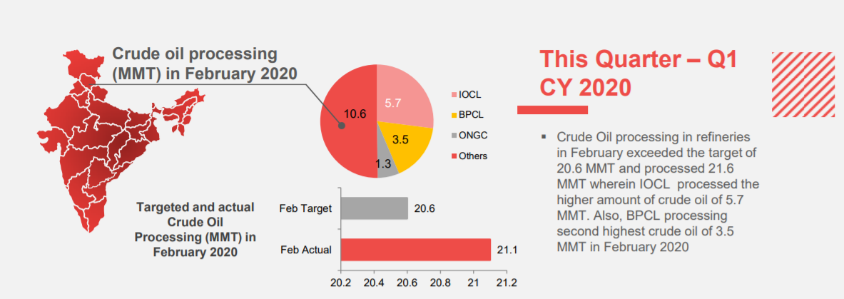 Crude Oil processing in refineries in February exceeded the target of 20.6 MMT and processed 21.6 MMT wherein IOCL processed the higher amount of crude oil of 5.7 MMT. Also, BPCL processing second highest crude oil of 3.5 MMT in February 2022