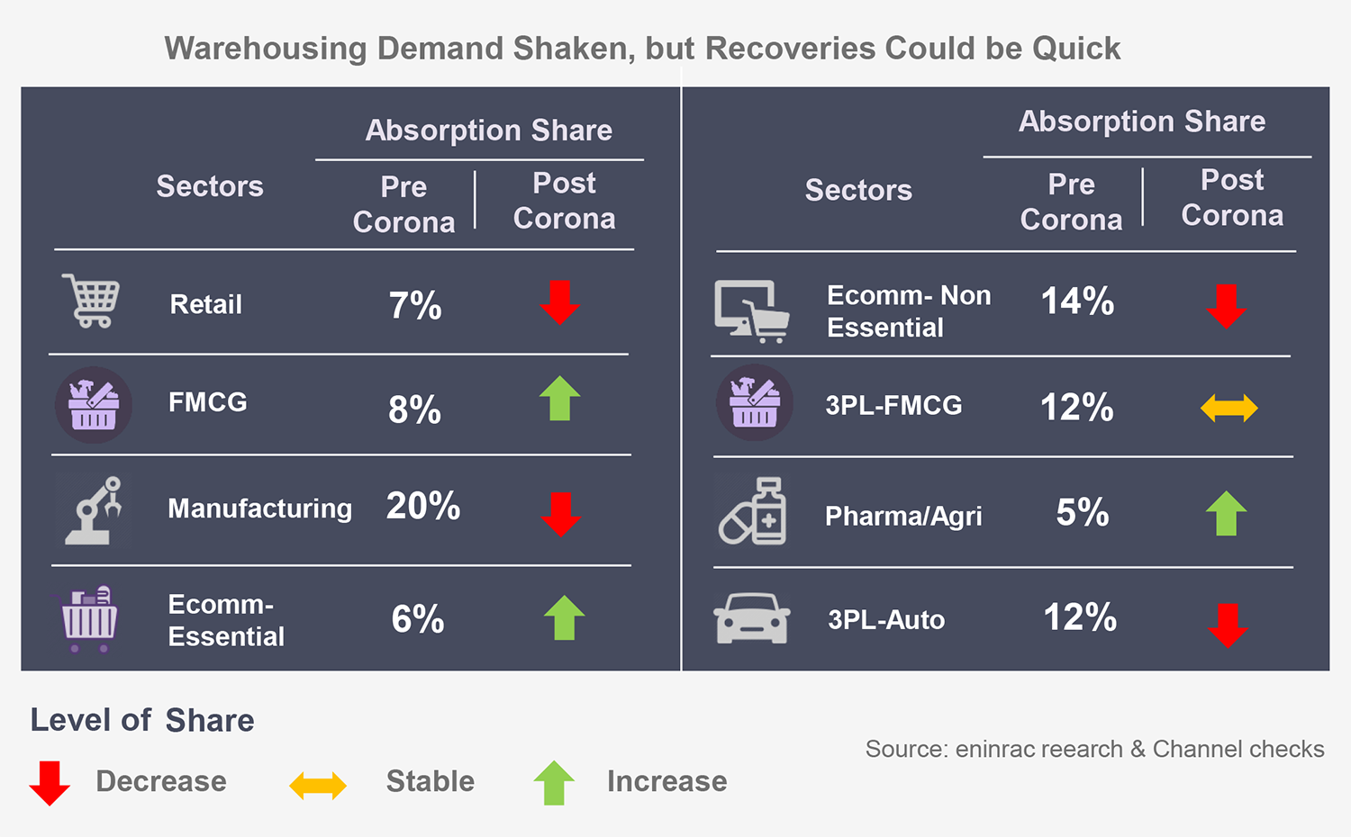 Supply Chain has been disrupted all around the world due to pandemic Covid-19. India too has not escape the wrath of the virus. Warehousing Demand Shaken, but Recoveries Could be Quick. 3PL, e-commerce & FMCG for essential goods / services & Pharma likely to recover the quickest.