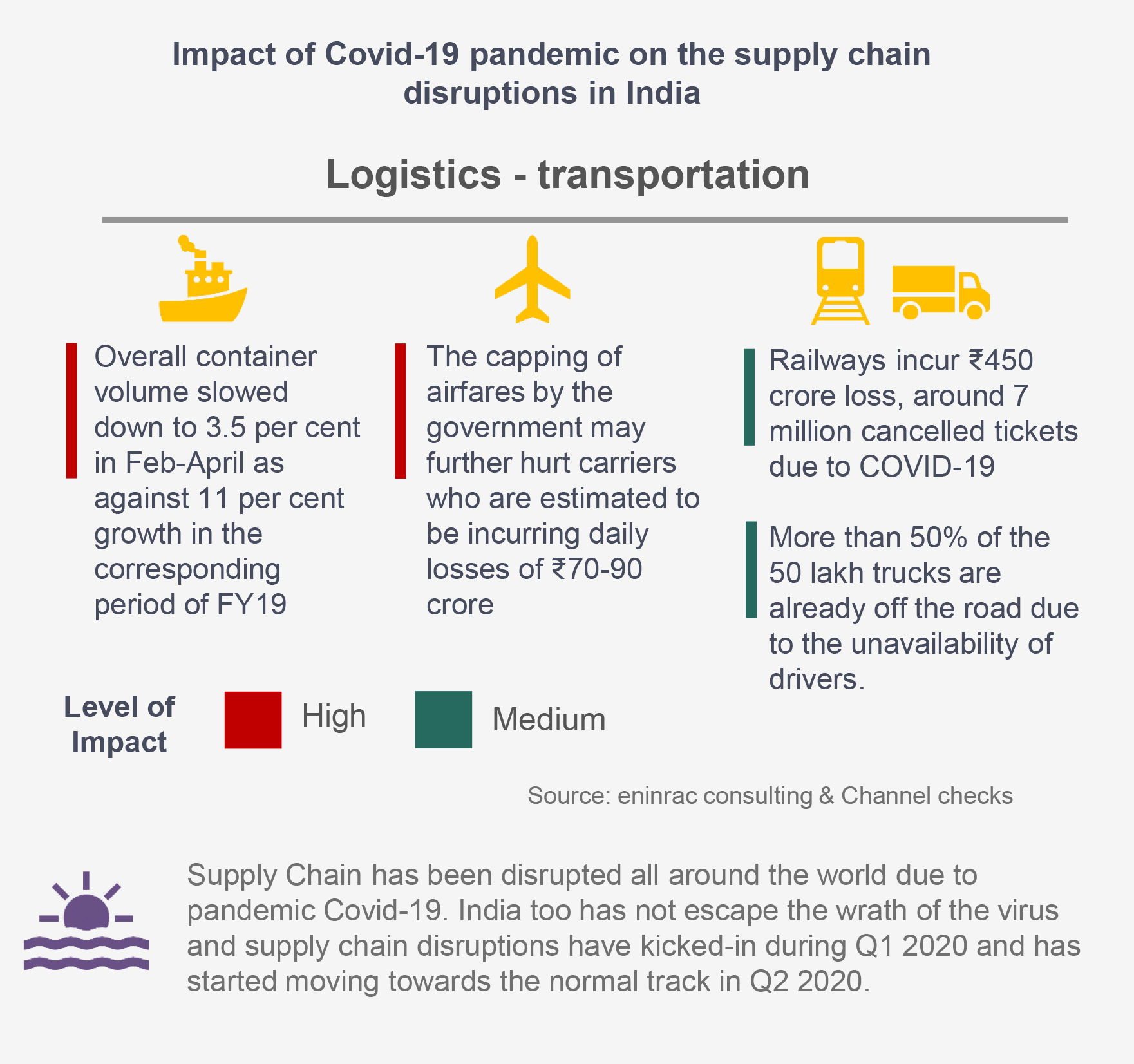 As the imposition of the lockdowns and the spread of Covid-19 disrupted the manufacturing facilities worldwide, the supply shock triggered the ripple effect on logistics and warehousing segment across the globe. Moreover, India too has not escape the wrath of the virus and affected the logistics segment. Notably, overall container volume slowed down to 3.5 per cent in Feb-April as against 11 per cent growth in the corresponding period of FY19. In addition, Railways incur INR 450 crore loss as movement of passengers has been suspended. Also, the freight corridors impacted due to shutting down of manufacturing industries. Furthermore, the largest hit sector is aerospace sector as Indian aviation industry could face INR 24,000 crore revenue loss. On the other hand, the warehousing segment is likely expected to grow quicker than other segments as investment deals of almost USD 600 million are underway in the warehousing space owing to greater attention to local sourcing in order to reduce the imports majorly from China.