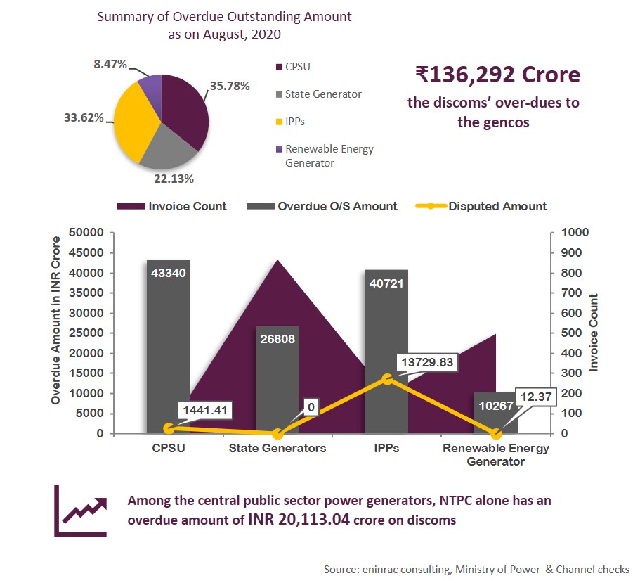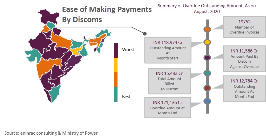 India's power distribution sector has been facing severe liquidity issues due to restricted cash flow, uncertain revenue due to closure of industrial and commercial operations, the prevailing low power demand in the sector and also because many consumers are unable to pay their electricity bills due to the coronavirus outbreak, which has led to discoms being unable to clear their outstanding dues with the power generating companies. Power producers' total dues owed by distribution firms rose over 40 per cent year-on-year to INR 1.36 lakh crore in August 2020, reflecting stress in the sector. In September, the Ministry of Power came out with a draft Standard Bidding Document (SBD) for privatisation of distribution licensees. It provides guidelines for states who want to offer their electricity distribution utilities to private players to improve operational efficiency and finances. Apart from taking privatisation route government has also taken up initiative to provide financial help by announcing INR 1.2 Lakh crore liquidity infusion package, which would help discoms to pay their dues to power generating companies. Discoms in Rajasthan, Maharashtra, Uttar Pradesh, Jammu & Kashmir, Telangana, Andhra Pradesh, Karnataka and Tamil Nadu account for the major portion of dues to power gencos.