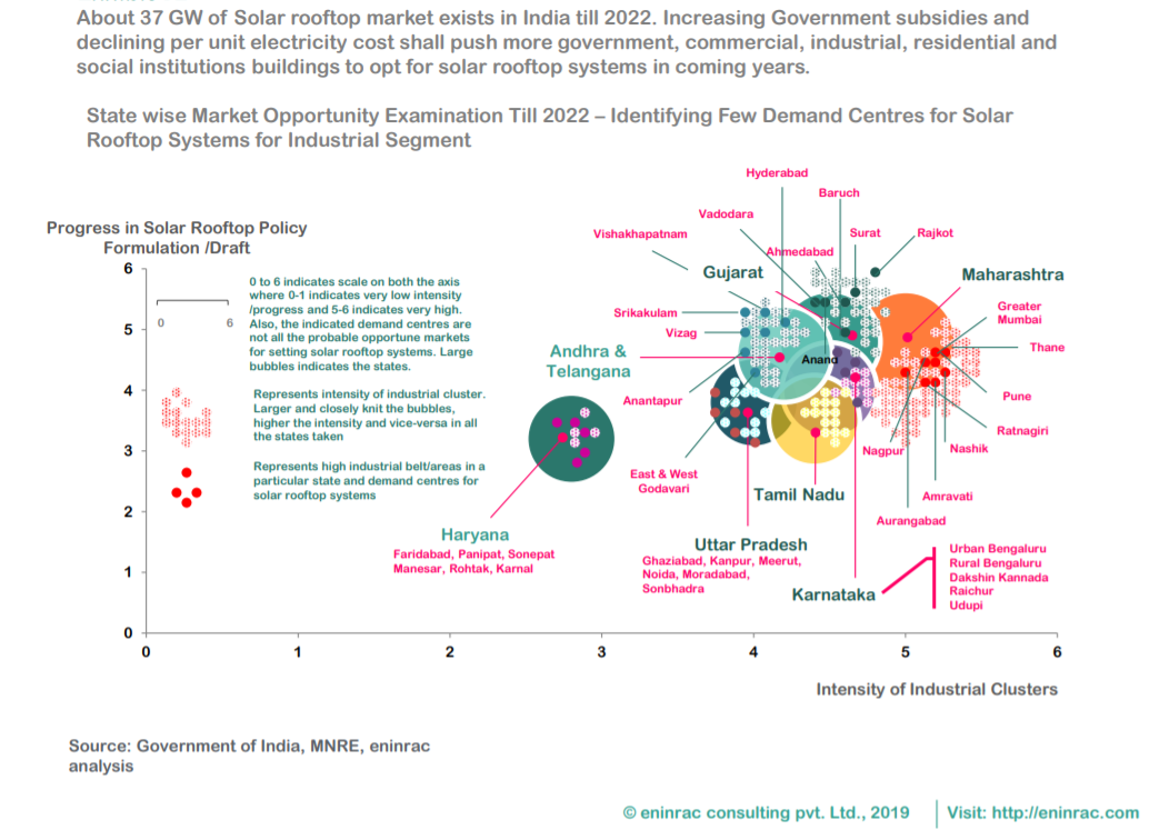 Examining state wise opportunities for grid connected solar rooftop applications and market sizing for discoms, OEMs, EPC contractors, project developers into residential, industrial , commercial and government segments