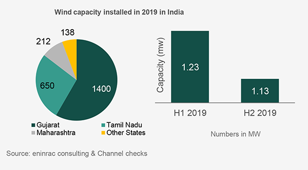 Wind installations levels in India have significantly declined after the reverse auction mechanism was introduced in the wind sector after several years of growth. Moreover, India installed only 2.4 GW (1.23 GW in H1 2019) of wind capacity in 2019 which is close to 34% below the estimated targeted wind capacity. The dismal response of the wind capacity addition is mainly attributed to the financial stress of turbine makers, land acquisition issues and grid connectivity delays resulting in denting investors sentiments in wind segment. However, COVID-19 outbreak has effected the supply chains that begin in or go through China. As a result of the factory shutdowns in China during H1 2021, many disruptions have been felt across the supply chain including the imports. Consequently, India turbine market take a hit due to restrictions on transportation of wind turbine from China as close to 80-85% of the wind turbine are imported from China. Thus, fresh investments in the wind energy segment to take a hit in India which shall have the cascading effect on new wind energy capacity additions in H1 2021